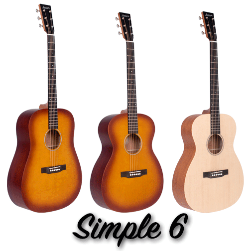 The Simple-6 is one of the latest additions to our satin series built right here in America. It is available in most body styles and features Mahogany back and sides paired with a BC Sitka Spruce top. This model is packed with traditional features, including open-back tuners, scalloped bracing, a hand-fit dovetail neck joint, and our new custom Sunset Sunburst finish. The Simple-6 not only looks great but also delivers exceptional sound quality.